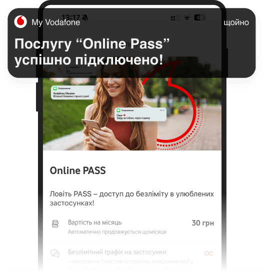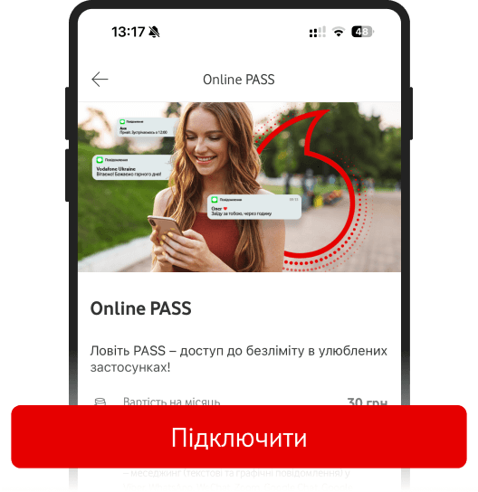Щоб підключити Online PASS наберіть запит *316*1# або скористайтесь застосунком My Vodafone («Мої послуги» – настисніть на Online PASS – «Підключити»).